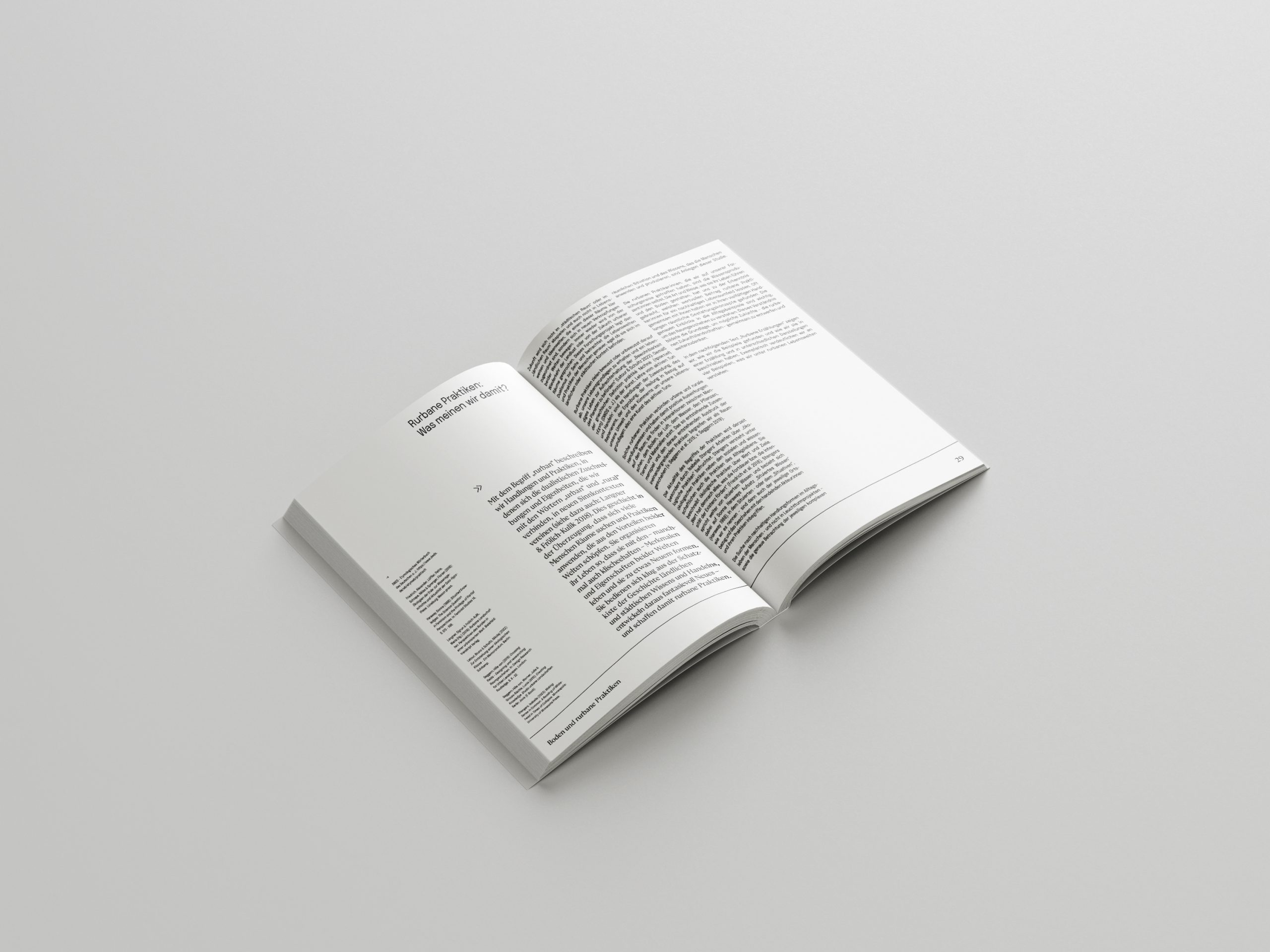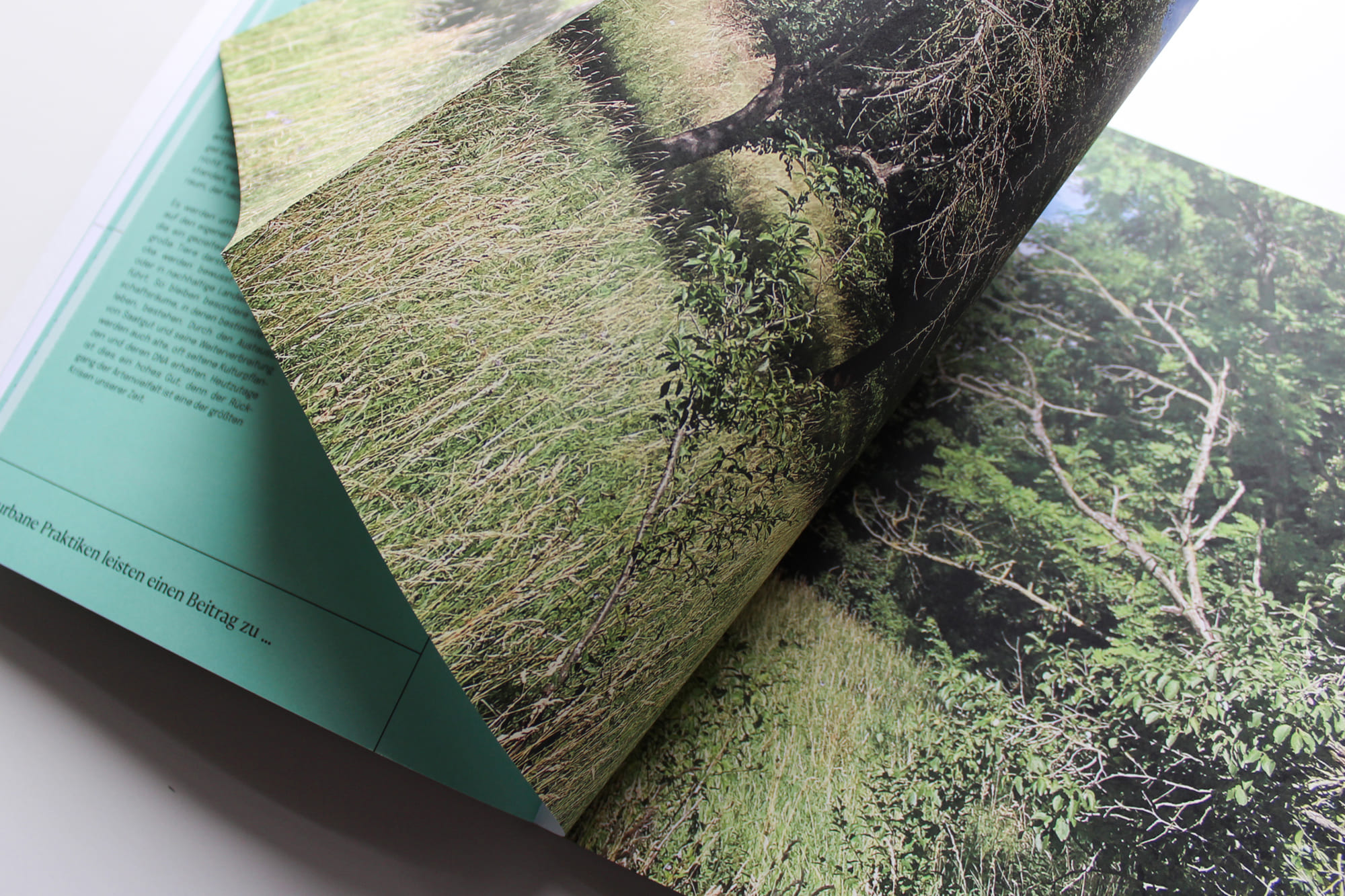 Dieses Buch erzählt wie die Räume und unser Leben aussehen könnten, wenn ländlich-städtisch Lebensweisen unseren Alltag bestimmen. Es beschreibt wie sich der Schutz unserer Ressourcen und die Artenvielfalt verbessern und wie diese Lebensweise das soziale Miteinander der Menschen stärkt. Das Design basiert auf einem strengen Raster. Es bedient sich der Äshetik von Kartographien. Die Prägungen des Umschlags zeigen die besuchten Orte. Sie brechen durch ihre dynamische Anordnung das Raster auf und geben eine Ausblick auf den Inhalt. Organische Grüntöne und eine offene Bindung unterstreichen den dokumentarischen Charakter der Publikation.